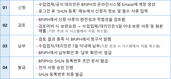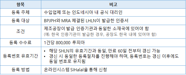 - 해외 할랄 인증서(SHLN, Sertifikat Halal Luar Negeri)는 BPJPH과 MRA을 체결한 해외 할랄 기관