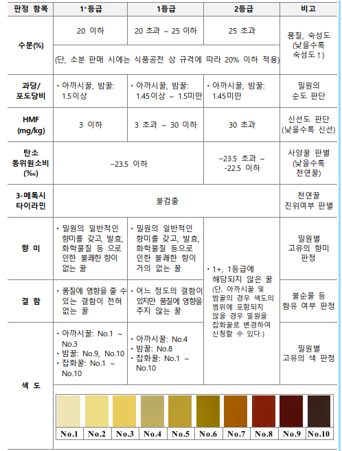 등급판정은 검사 결과를 토대로 수분, 탄소동위원소비, 과당/포도당비, HMF(가열 정도), 향미, 색도 등 기준에 따라 총 21개 항목에 의해 판정된다.