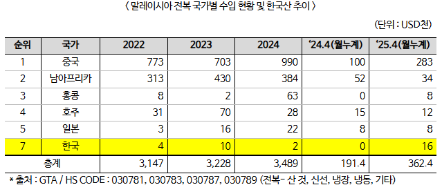 - Global Trade Atlas(GTA)의 데이터에 따르면, 2025년 4월 기준 말레이시아로 수출된 한국산 전복 수입액은 약 16천 달러로, 전년도