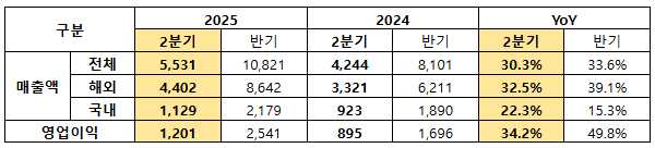 해외부문 성장세 2분기 매출 5531억 영업이익 1201억