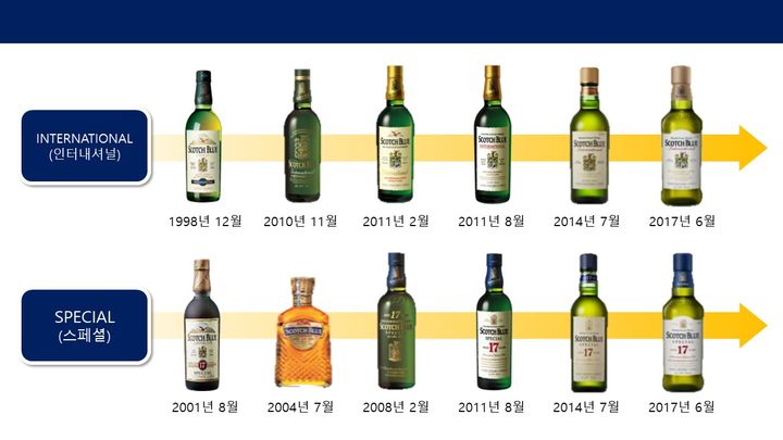 당초 계획에서 500㎖ 병 제품을 추가한 다음, 그 해 8월 18일 국내 최초로 고품질·고품격의 21년 위스키 '스카치블루' 500㎖와 700㎖ 병 제품을 출시했다.