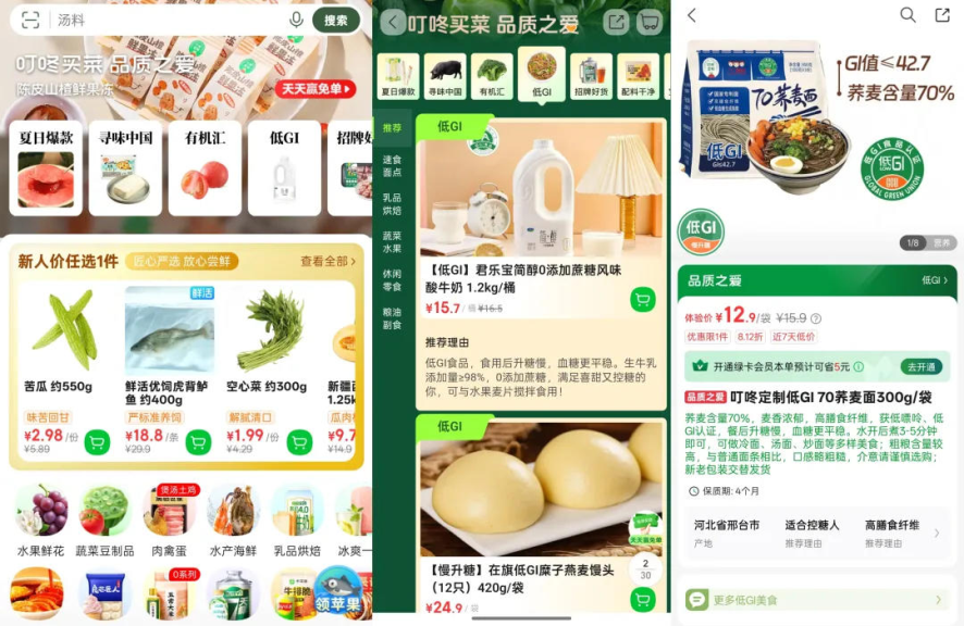 그중에서도 딩동마이차이는 저GI 식품 전용 구역을 최초로 만들었으며, 전 품목, 전 시나리오의 저GI 제품 개발을 계획 중이라고 밝혔다. 2025년 상반기 데이터에 따르면, 클린 라벨이 붙은 상품의 매출은 5억 위안을 돌파했고, 저GI 상품 매출은 2023년 상반기 100만 위안 미만에서 약 6,000만 위안으로 급증하며 빠르게 성장했다.