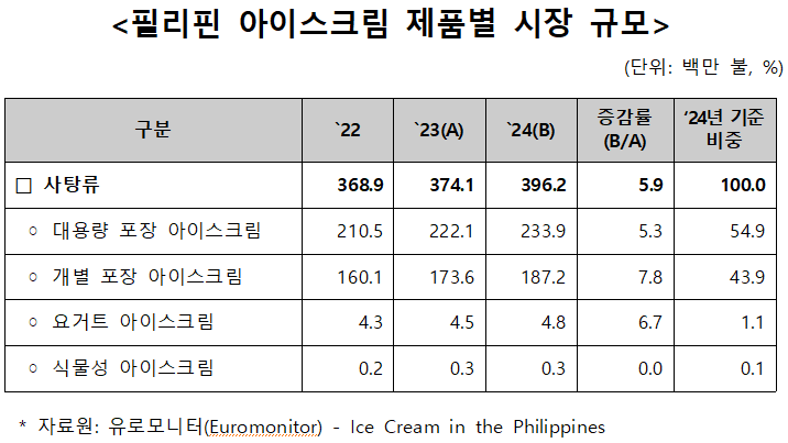 - 열대의 나라, 필리핀에서 한여름의 간식으로 아이스크림은 많이 소비되고 있으며, 2024년 기준 필리핀 아이스크림 시장 규모는 약 4억 2,620만 달러로 전년도 대비 6.4% 성장하였으며, 향후 2030년까지 연평균 5.7% 성장할 것으로 예상되는 가능성이 높은 시장임