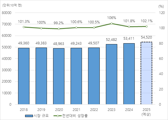 일본의 외식 시장은 2020년 4월 제1차 코로나 긴급 사태 선언으로 큰 타격을 입으며 급격히 침체됐다. 이후 2021년 코로나 사태가 완화되며 점진적으로 회복세로 전환됐고, 2023년에는 시장 규모가 약 31조2410억 엔으로 코로나 이전 수준을 웃돌았다. 또한 일본 푸드서비스 협회의 조사에 의하면, 2025년 8월 기준 외식업 전체 매출은 전년도 대비 8.4% 증가하며 안정적인 성장세를 이어가는 중이다.