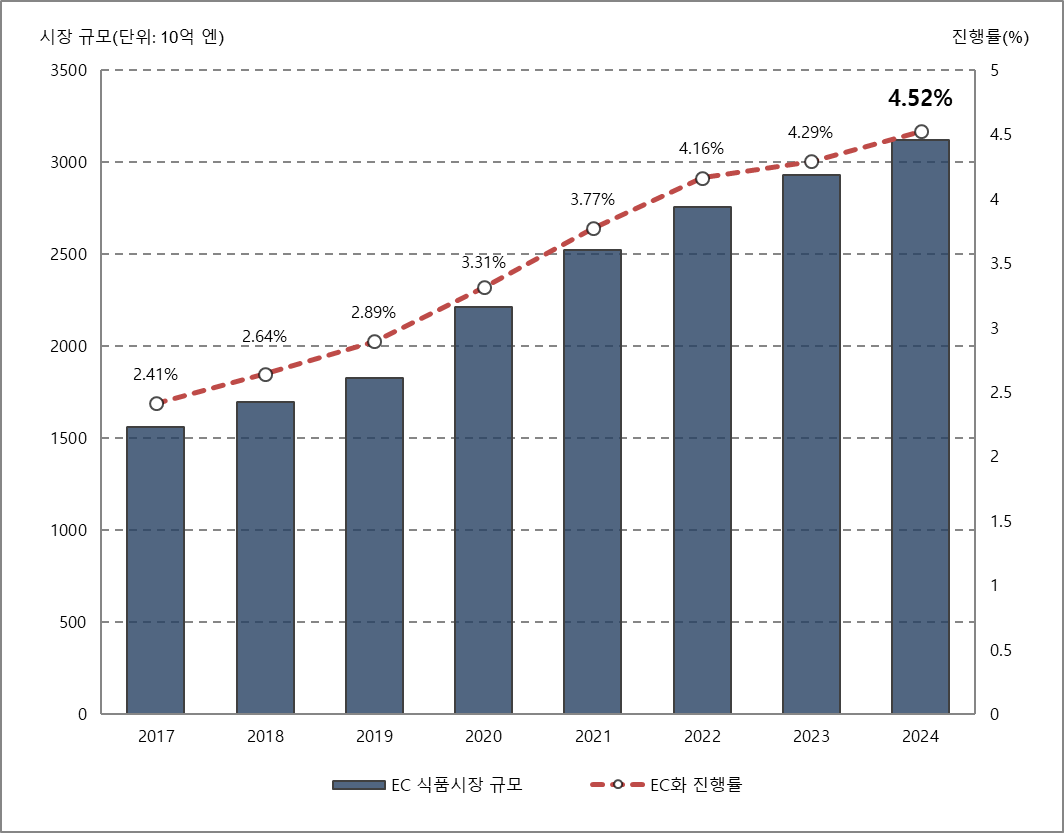 특히 눈에 띄는 변화는 EC(전자상거래) 채널의 성장이다. 2024년 EC 시장의 전체 규모 약 15조2194억 엔 중 식품 및 음료(주류 포함)의 판매액은 전년 대비 6.4%가량 증가한 3조1163억 엔을 기록했다. EC화 진행률 및 채널 규모는 연이은 상승세를 기록하고 있다.