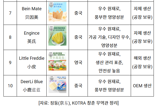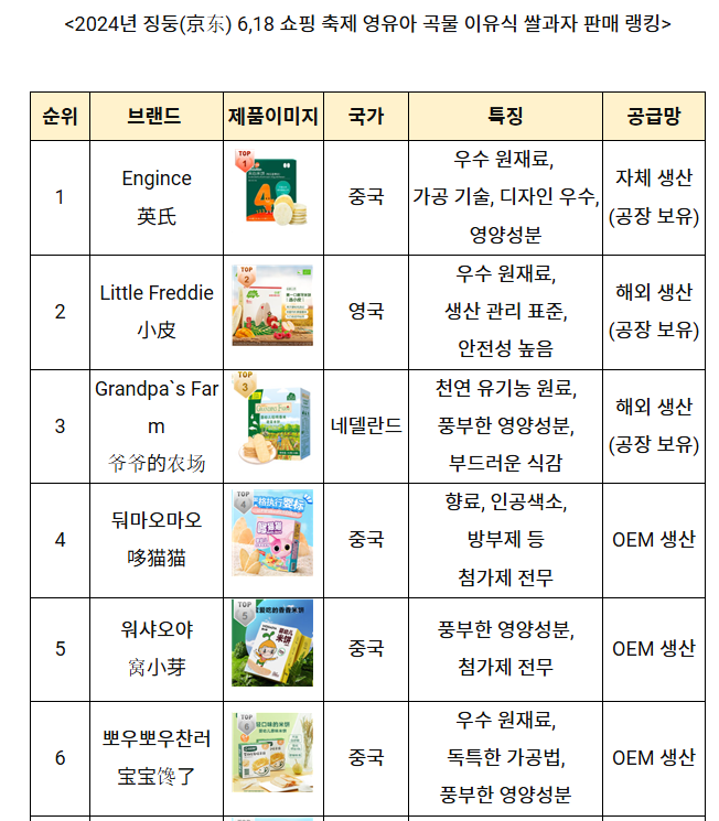 2024년 징둥(京东)의 618 쇼핑 축제 시기에 영유아 곡물 이유식 쌀과자 판매 랭킹 TOP 10에는 중국 브랜드가 7개, 외국 브랜드 3개가 선정됐다. 중국 브랜드 7개사 중 3개사는 자체 공장에서 생산하고 있으며, 4개사는 OEM 생산을 하고 있다. 해외 브랜드 Grandpa`s Farm, Little Freddie 등 3개사 제품은 해외 수입을 통해 중국에서 유통되고 있다.
