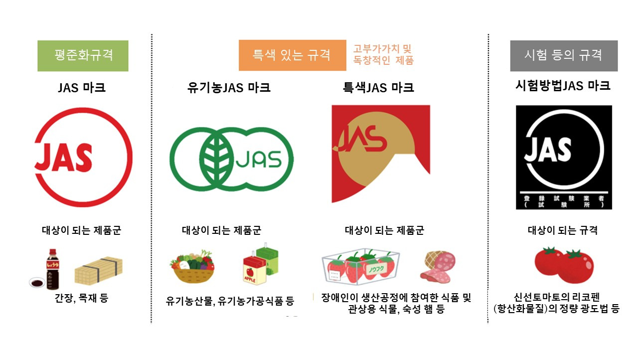JAS는 일본 농림 규격(Japanese Agricultural Standards)의 앞 글자를 딴 통칭으로 음식료품, 유지, 농산물, 임산물, 축산물, 수산물 등의 품질과 성분, 생산방법, 관리, 서비스 등의 기준을 농림수산대신이 정하는 국가 규격이다. 국가가 인정한 등록인증기관으로부터 인증을 받으면, 그 증거로 일본 농림규격을 충족하는 제품이나 광고 등에 JAS 마크를 표시할 수 있다. 그렇다면 왜 이런 규격이 생긴 걸까? JAS에 관한 법률이 처음 제정된 것은 약 75년 전인 1950년으로, 당시 전후의 혼란과 물자 등의 부족으로 인하여, 시장에는 품질이 나쁜 제품이 마구잡이로 유통되고 있었다. 이러한 상황을 해소하기 위해, 시장에 유통되는 농산, 수산품을 비롯하여, 식품의 품질 및 사양을 일정한 범위와 수준에 맞추기 위한 기준을 마련할 필요가 있었다. 인증 건수도 최근 2010년부터 2024년에 걸쳐서 4,106건에서 6,040건으로 약 1.5배나 증가한 것으로 나타났다.