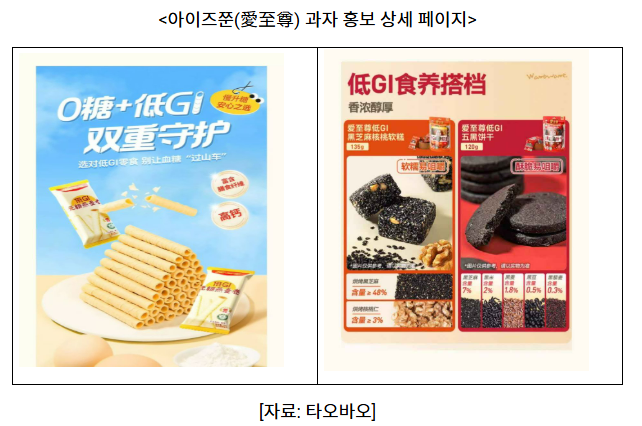 2025년 초 왕왕(旺旺) 그룹 산하의 실버 세대 식품 브랜드인 아이즈쭌(愛至尊)은 간식으로 고령층의 일상적인 건강 관리를 보조하고자 저GI(혈당지수) 오흑(五黑) 비스킷과 저GI 흑임자 호두 케이크 등 다양한 신제품을 출시했다. 그중에서 오흑(五黑) 비스킷과 흑임자 케이크는 도우인(抖音) 플랫폼에서 출시 한 달 만에 판매량 100만 개를 돌파했다. 제품 디자인 및 포장은 고령층 친화적인 디자인을 적용하고, 섭취 용이성과 식감을 고려해 편하게 먹을 수 있도록 제품을 업그레이드하였다.