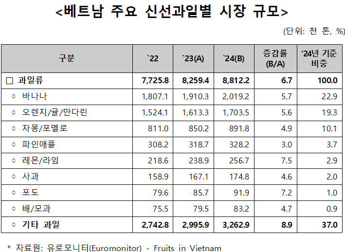 - 유로모니터의 베트남 과일 시장 보고서에 따르면 단감은 기타 과일로 분류되며, 베트남에서 유통되는 과일의 순서는 바나나, 오렌지, 자몽, 파인애플 등 열대과일이 주로 소비되고 있음