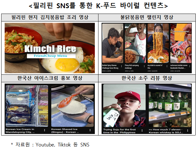 - 2023년 하반기부터 급성장한 TikTok Shop은 젊은 소비층을 중심으로 K-푸드 홍보의 핵심 채널로 부상하고 있으며, 특히 “불닭볶음면 챌린지” 와 “김치볶음밥 쿡방” 등의 바이럴 콘텐츠가 필리핀 SNS에서 수백만 뷰를 기록하면서 한국식품 인지도를 크게 끌어올렸음