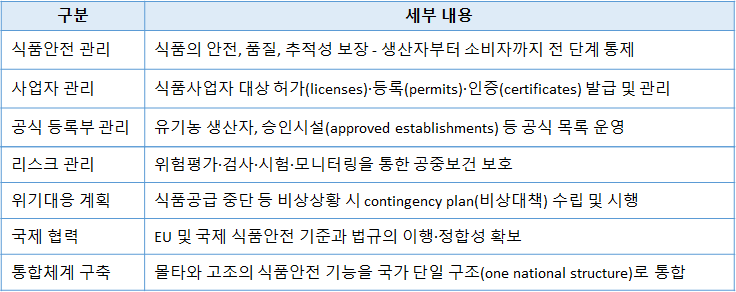 - 몰타 제도 전역에서 식품의 안전성 확보 및 공급망 신뢰성 유지를 위한 중앙 관리 기능을 수행