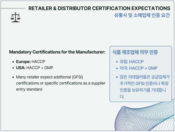 “HACCP은 유럽 전역에서 기본 의무이며, GFSI 계열의 인증제도(IFS, BRC 등)는 사실상 필수 요건으로 간주된다. 미국의 경우 FDA 등록과 GMP 기준 준수는 물론, NSF 인증은 미국 내에서 ‘신뢰의 상징’으로 여겨진다”고 설명했다.