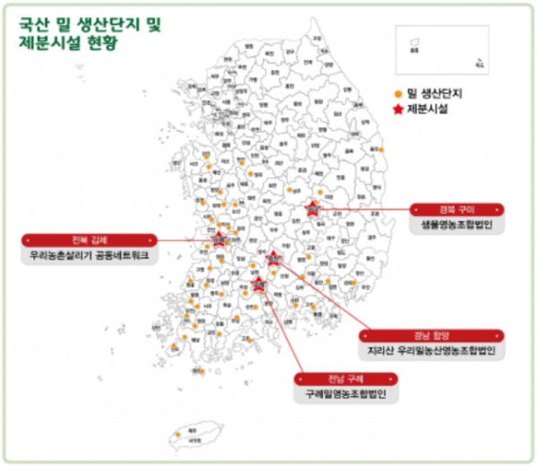 전남 구례의 구례밀영농조합은 우리나라 1호 국산밀 제분소를 리모델링해 최신 Bühler(스위스) 설비로 교체했다. 연간 2,000톤 규모의 백밀가루·유기밀가루 등 다양한 제품을 생산한다.