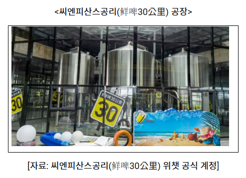 이러한 성장의 중심에는 MIXUE(蜜雪冰城)와 씨엔피산스공리(鲜啤30公里) 등 프랜차이즈형 브랜드의 등장과 운영 혁신이 있다. MIXUE는 가격 경쟁력과 공급망 효율화를 결합해 초저가 생맥주 시장을 개척하고 있으며, 씨엔피산스공리는 ‘신선도 30km 원칙’을 내세워 품질 중심의 차별화 전략을 강화하고 있다. 두 기업 모두 ‘생맥주는 신선함이 경쟁력’이라는 공통된 인식 아래, 생산–물류–유통을 일체화한 운영 모델을 구축하고 있다는 점에서 주목된다.