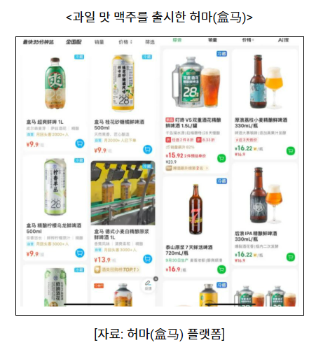 이와 같은 흐름은 최근 정체된 중국 주류 시장에도 영향을 미치고 있다. 전통적인 맥주 소비가 둔화되는 가운데, 일부 기업들은 커피 산업의 사례에서 영감을 얻어 맛과 향을 다양화한 신제품을 통해 활로를 모색하고 있다. 과일, 설탕, 차 등을 접목한 ‘풍미형 맥주’가 SNS와 유통 채널을 중심으로 빠르게 확산되고 있으며, 허마(盒马), 딩동(叮咚) 등 뉴리테일 플랫폼도 계절 과일을 활용한 한정판 맥주를 선보이며 젊은 소비층의 호응을 얻고 있다.