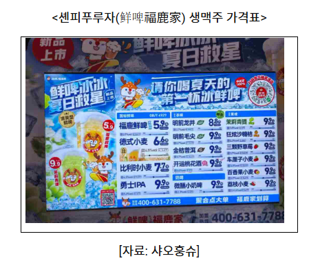 한편 셴피푸루자(鲜啤福鹿家)는 기존의 ‘맥주 애호가’ 중심 브랜드들과 달리 합리적인 가격대와 일반 Z세대 소비자의 취향을 겨냥한 제품 전략을 채택하고 있다. 전통적인 생맥주 외에도 차(茶)의 향을 더한 차맥주(茶啤), 과일맥주 등 다양한 제품군을 보유하고 있으며, 알코올 도수 역시 2.3~5도 수준으로 비교적 낮아 젊은 소비층의 선호를 얻고 있다.