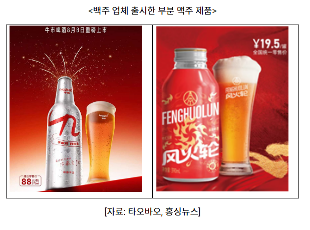 일부 백주 기업은 맥주 시장으로의 사업 다각화에도 적극 나서고 있다. 올해 8월 초, 우량예 산하 셴린생태주업(仙林生态酒业)은 새로운 수제맥주 브랜드 ‘풍화륜(风火轮)’을 출시하며 중·고급 수제맥주 시장에 공식 진출했다. 또한 전주이두(珍酒李渡)는 8월 8일 알코올 도수 5.9% 수제맥주 ‘NEWS(중국 브랜드명 牛市)’를 선보였다. 해당 제품은 병당 88위안으로, 프리미엄 맥주 시장을 겨냥한 전략적 신제품으로 평가받고 있다.