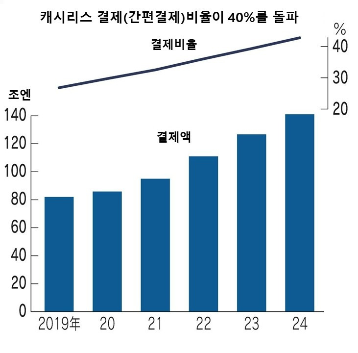 경제산업성에 의하면, 2024년의 일본의 현금이 아닌 방식의 결제액은 총 141조 엔으로, 이는 전체 개인 소비에 42.8%를 차지하였다. 이중 결제 단가가 높은 신용카드 결제가 전체의 80%를 차지하는 반면 결제 횟수 기준으로는 전자결제 등 QR코드가 30%를 차지하고 있다. 신용카드의 원터치 결제의 보급이나 QR코드의 결제 금액의 상한을 높임으로써, 결제 수단의 구분 또한 희미해지고 있다.