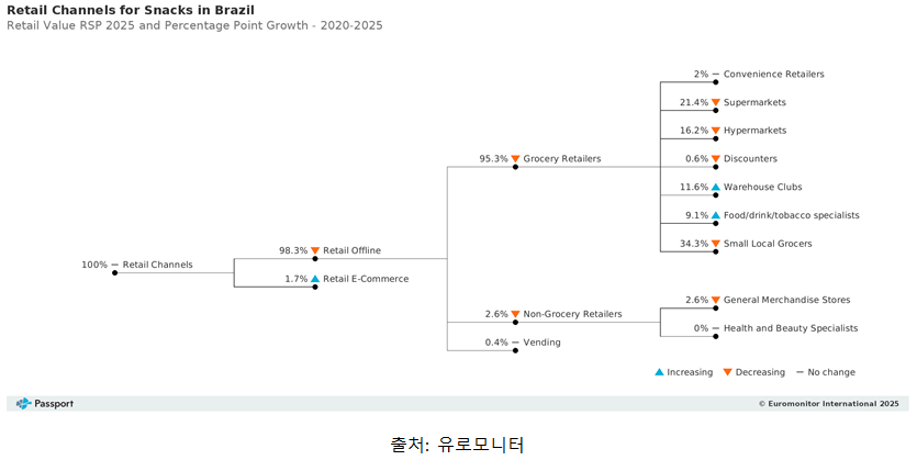 • 브라질 스낵 유통은 여전히 소형 식료품점 중심이지만, 2025년 현재 그 비중은 점차 줄어들고 있다. 방문 빈도와 접근성 면에서는 여전히 강점을 지니지만, 창고형 매장과 편의점이 급성장하며 경쟁이 심화되고 있다.