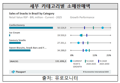 • 스낵 시장 내 주요 카테고리 규모로는, 초콜릿·캔디류(Confectionery) 가 약 505억 헤알(한화 약 14조 원)로 가장 큰 비중을 차지하고 있다. 그 뒤로 비스킷·스낵바·과일 스낵류(Sweet Biscuits, Snack Bars & Fruit Snacks) 가 약 343억 헤알(한화 약 9조 5천억 원), 감자칩·옥수수 등 짭짤한 스낵(Savoury Snacks) 이 약 273억 헤알(한화 약 7조 6천억 원) 규모를 형성하고 있다. 아이스크림(Ice Cream) 은 약 196억 헤알(한화 약 5조 4천억 원) 수준으로, 상대적으로 규모는 작지만 소비 시즌성과 프리미엄화 트렌드가 함께 작동하며 성장 여지를 보이는 카테고리로 평가된다.