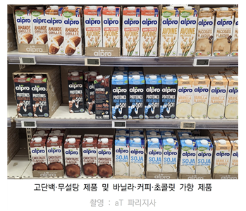 현재 프랑스 식물성 대체 유제품 시장에는 우유, 요구르트, 치즈를 모방한 제품들이 유통되고 있다. 이 중 식물성 우유는 가장 큰 시장 규모를 자랑하는 품목이다. 2025년 기준 매출액이 2억 4,120만 유로(약 3,979억 원)로 추정되며, 이는 전체 식물성 대체 유제품 시장 규모인 4억 700만 유로(약 6,715억 원)의 60% 가량이다.