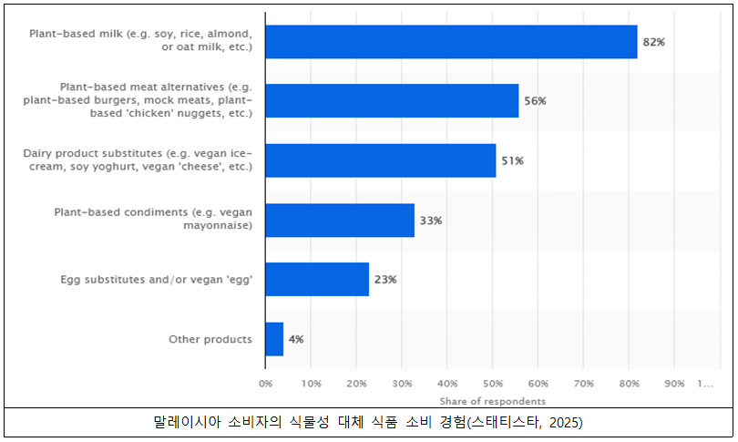 스태티스타 자료에 따르면, 말레이시아 소비자들은 식물성 대체식품 중 식물성 음료를 가장 많이 이용하고 있으며(82%), 이 분야가 시장의 사실상 ‘입문 제품’ 역할을 하고 있다. 뒤이어 식물성 고기(56%)와 유제품 대체품(51%) 등이 비교적 빠르게 수용되고 있는 반면, 식물성 소스류(33%)와 계란 대체품(23%)은 여전히 낮은 이용률을 보여 조리 활용 방식이나 맛 적응에 추가적인 개선이 필요함을 시사한다. 기타 제품군은 이용률이 4%에 그쳐 새로운 카테고리 제품들에 대한 소비자 인지가 여전히 제한적인 것으로 나타났다.