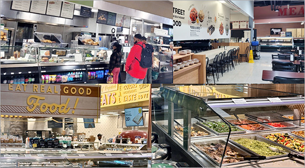 조지아주에 있는 식료품점 퍼블릭스(Publix)에서는 최근 델리 매장 옆 빈 공간에 테이블과 의자를 배치해 쇼핑객들이 구매한 식품을 바로 먹을 수 있게 했다. 유기농 식품 전문 식료품점으로 알려진 홀푸즈는 이미 여러 매장 내에 식료품점에서 구매한 음식을 먹을 수 있는 카페 형식의 공간을 설치해 왔으며, 2022년 뉴욕 맨해튼 지점에서는 1층에 식료품점과 2층에는 식당과 카페를 배치하는 새로운 방식의 식료품점 매장을 오픈했다.