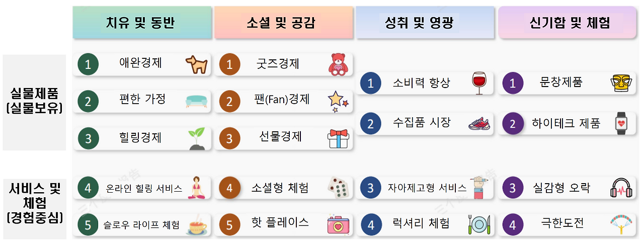 자신의 내면적 만족과 행복을 중시하는 소비 | 복장, 향수/디퓨저, 스포츠 및 헬스, 애완경제 등 |
