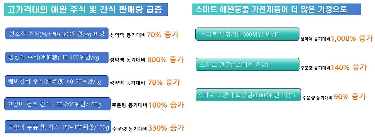 <고가격대의 애완 식품 및 스마트 용품 성장 현황>