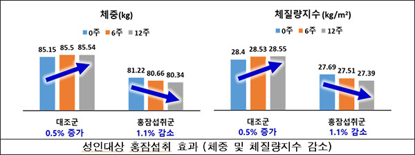 연구진은 전임상 결과를 바탕으로 산업체와 함께 인체적용시험을 했다. 전북대병원, 원광대학교 전주한방병원이 모집한 성인 72명을 대상으로 12주간 하루 1.2g씩 홍잠 분말을 섭취하게 한 후 건강 개선 여부, 안전성 등을 종합적으로 평가했다.