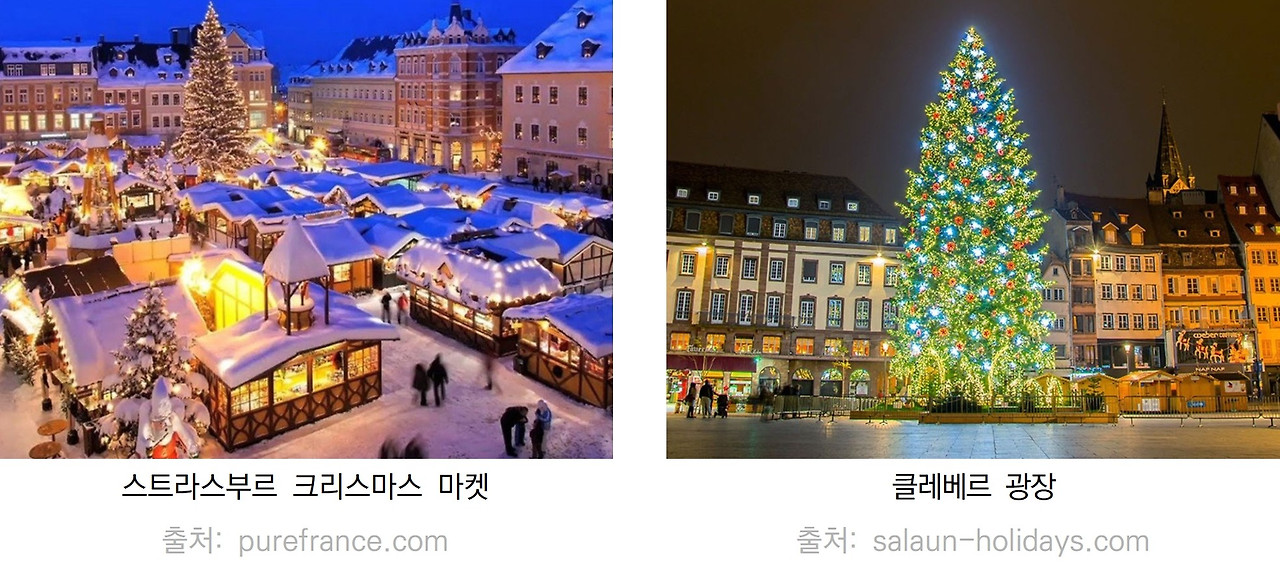 프랑스에서는 스트라스부르(Strasbourg) 크리스마스 마켓이 가장 유명하다. 1570년 시작되어 프랑스에서 가장 오랜 역사를 자랑하는 크리스마스 마켓이기도 하다. 스트라스부르는 앞서 언급한 알자스 지방에 위치해 있으며, 크리스마스의 수도(Capital de Noël)라고도 불리는 도시다. 세계 문화유산으로 등재된 클레베르 광장(Place Kléber)에는 대형 크리스마스 트리가 들어서고, 통나무집처럼 꾸며진 부스(chalet)에서는 알자스 지방 특산물로 만든 먹거리와 수공예품을 판매한다. 올해는 11월 26일부터 12월 24일까지 운영된다.