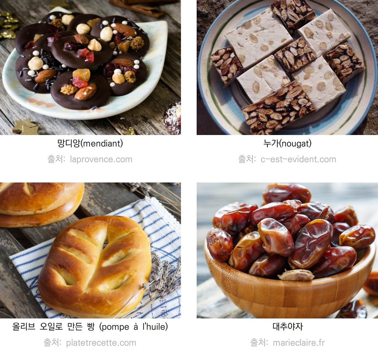 후식으로는 예수와 열두 제자를 상징하는 13가지 디저트가 준비된다. 13가지 디저트에 포함될 수 있는 디저트는 다양하지만, 망디앙(mendiant), 흰색·검은색 누가(nougat), 대추야자, 올리브 오일로 만든 빵(pompe à l'huile) 혹은 지바시에(gibassié)는 필수로 여겨진다. 이 중 망디앙은 한 입 크기로 동그랗게 펼친 초콜릿 위에 견과류와 건과일을 올려 만드는 디저트다. 망디앙은 프랑스어로 거지, 걸인을 뜻하는 단어로, 망디앙 위에 올라가는 건무화과, 건포도, 아몬드, 헤이즐넛·호두는 각각 중세 시대에 자선에 의존해 살아간 탁발 수도회(ordres mendiants)의 복색을 상징한다. 한편 대추야자는 유일하게 허락된 이국 과일로서, 그리스도를 상징하며 집안에서 가장 아름다운 접시에 담겨야 한다.