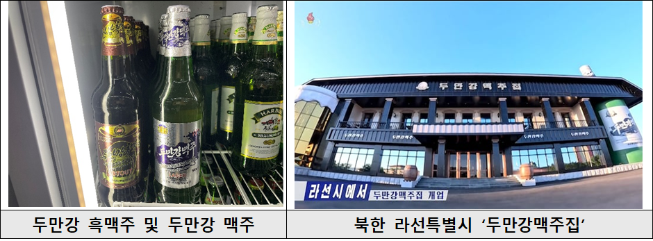 블라디보스톡 시중 편의점에서 판매되고 있는 맥주 ‘두만강’의 모습(좌) / 북한 라선특별시에 위치한 ‘두만강맥주집’ (우)