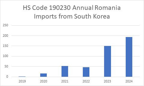 Eurostat 자료를 기반으로 한 Global Trade Atlas(GTA)에 따르면, 루마니아의 HS Code 1902.30 품목(인스턴트 누들 및 라면을 포함한 ‘기타 파스타’)에 대한 對한국 수입은 지난 5년간 뚜렷한 성장세를 보인다. 이는 한국 식품에 대한 현지 소비자 수요 증가와 현지 유통망 확대가 복합적으로 작용한 결과로 분석된다. 2019년 이후 루마니아의 한국 제품 수입은 약 200배 가까이 증가했으며, 이는 한국 제품이 소규모 거래에서 출발해 루마니아 시장에 성공적으로 진입했음을 방증한다. 특히 2022년부터 2024년 사이 한국산 라면 제품의 수입량이 많이 증가했으며, 2024년에는 전년 대비 약 30%의 증가율을 기록하는 등 현재까지도 뚜렷한 성장 추세를 유지하고 있다.