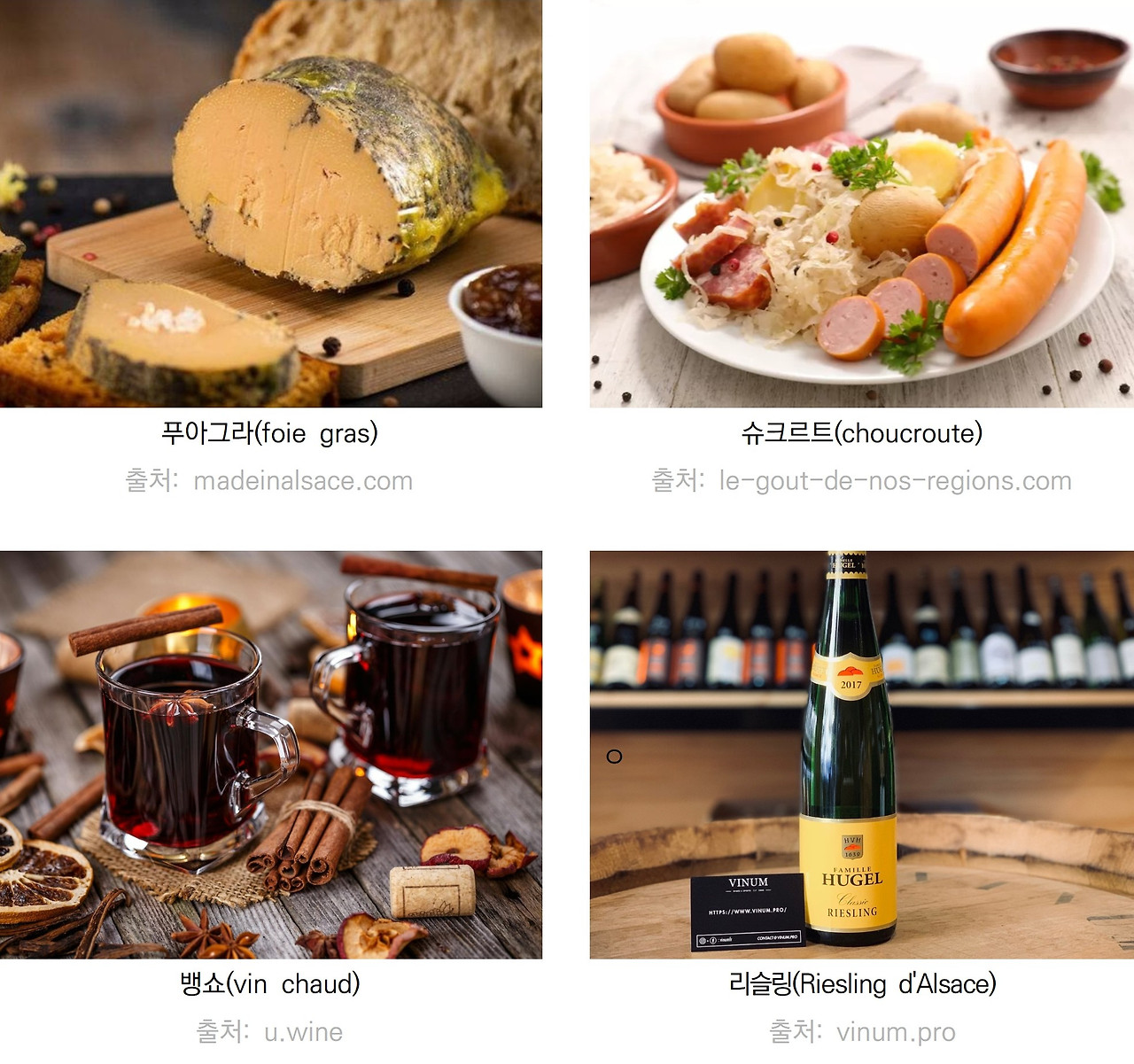 크리스마스 요리로는 푸아그라(foie gras), 발효한 양배추인 슈크르트(choucroute), 얇은 반죽에 크림, 베이컨, 양파 등을 얹어 구운 타르트 플랑베(tartes flambées) 등 알자스 전통 음식을 먹는다. 음료로는 와인에 과일과 향신료를 넣고 끓인 뱅쇼(vin chaud)나 알자스 지방 와인인 리슬링(Riesling)을 곁들인다.