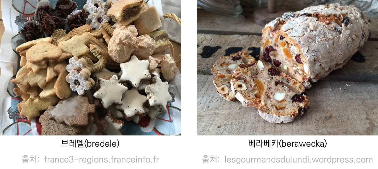 독일과 국경을 맞대고 있는 알자스(Alsace) 지방에서는 크리스마스를 기다리면서 집에서 비스킷을 구워 먹거나 선물하는 전통이 있다. 알자스에서는 크리스마스 비스킷을 브레델(bredele)이라고 부르는데, 지역에 따라 bredle, bredala, bradala이라고 하기도 한다. 보통 아몬드와 계피 등이 들어가지만, 집집마다 레시피가 다르다. 베라베카(berawecka)는 건과일, 견과류, 브랜디에 절인 과일 등이 들어간 빵으로, 얇게 썰어서 먹는다.
