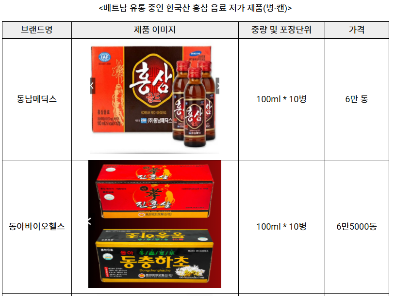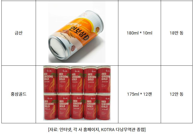 둘째, 캔·병 형태의 저가 홍삼 음료 역시 뗏 시즌에 많은 소비자들이 찾는 인기 품목이다. 상대적으로 가격 부담이 적고 대량 구매가 가능해, 선물 바구니(뢰)에 다른 제품들과 함께 구성하기에도 용이하다. 또한 명절 기간 방문 손님에게 제공하는 접대용 음료로 활용도가 높아 판매량이 꾸준히 증가하는 추세다.
