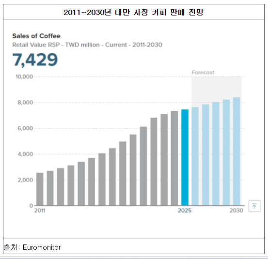 2025년 11월에 발표된 유로모니터 보고서에 따르면, 대만의 커피 소매 시장은 2025년 기준 약 74.29억 대만달러(한화 약 3,500억 원) 규모를 기록할 것으로 예상되며 이는 전년 대비 약 2% 증가한 수치로 파악된다. 2026년부터 2030년까지의 연평균 성장률은 약 2% 이상으로 예상되는 가운데, 2030년에는 커피 판매량이 약 83.71억 대만달러(한화 약 3,940억 원)로 증가할 것으로 전망된다.
