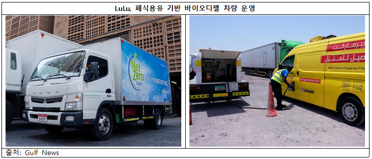 LuLu는 지난 2025년 6월부터 폐식용유(Used Cooking Oil)를 수거하여 바이오디젤(Biodiesel)로 재활용하여 이를 자사의 배송 차량 연료로 활용하는 친환경 물류 체계를 운영하고 있다.