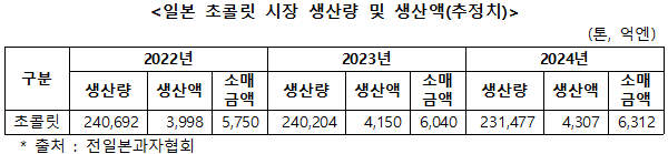 전일본과자협회(全日本菓子協会)에서 발표한 통계자료에 따르면 2023년에 처음으로 6억엔을 돌파한 초콜릿 시장은 카카오 가격 상승으로 인해 2024년 초콜렛 생산 수량은 23만 1,477톤으로 전년동기 대비 3.6% 감소하는 한편, 생산금액은 4,307억엔, 소매금액은 6,312억엔으로 전년동기 대비 각각 3.8%, 4.5% 증가했다.