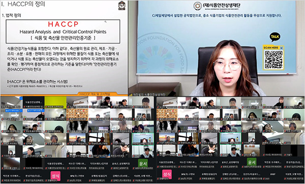 재단은 지난 12일 중소 식품기업 관계자들을 대상으로 줌(ZOOM)을 활용한 ‘HACCP(식품안전관리인증기준) 기본과정 온라인 교육’을 실시했다고 밝혔다. 이번 교육은 CJ제일제당 품질개선팀 김양하 과장을 전문 강사로 초빙해 약 4시간 동안 진행됐다.