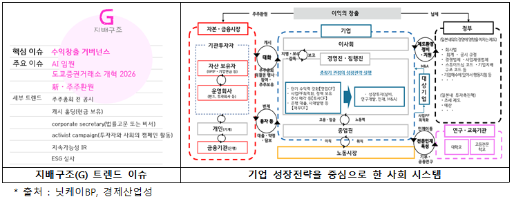 - 일본의 지배구조(G) 트렌드는 수익창출 거버넌스 강화, AI 기반 의사결정 도입, 도쿄증권거래소 시장개혁 2026, 新·주주환원 기조를 중심으로 전개되고 있다. 이는 자본 효율성과 경영 투명성을 중시하는 일본 기업지배구조 개편 흐름으로 식품 기업에도 직접적인 영향을 미치고 있다.