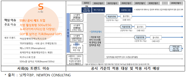 - 일본의 사회(S) 분야 ESG 트렌드는 SSBJ 공시 제도 도입, 지역 활성화형 SDGs·ESG 정책, 인재 다양성 확대, 비재무 가치 중시(Beyond GDP)를 중심으로 전개되고 있다.