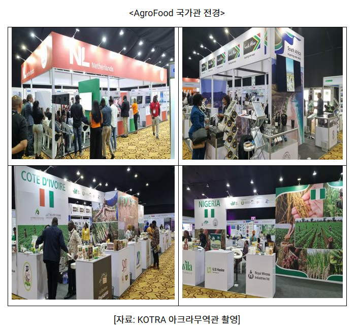 네덜란드는 12개 기업을 포함한 국가관을 만들어 농업기술 혁신과 관련된 솔루션을 선보였다. 국제무역센터(ITC, International Trade Centre)는 10개 기업으로 구성된 나이지리아 국가관 및 10개 기업으로 구성된 코트디부아르 국가관을 지원했다. 나이지리아는 카사바, 옥수수, 양파, 쌀 등을 위주로 전시했고, 코트디부아르는 파인애플, 옥수수, 쌀, 카사바 등을 전시했다. 남아프리카공화국 국가관은 와인 등 음료 및 포장 기술을 중점적으로 내세웠다.