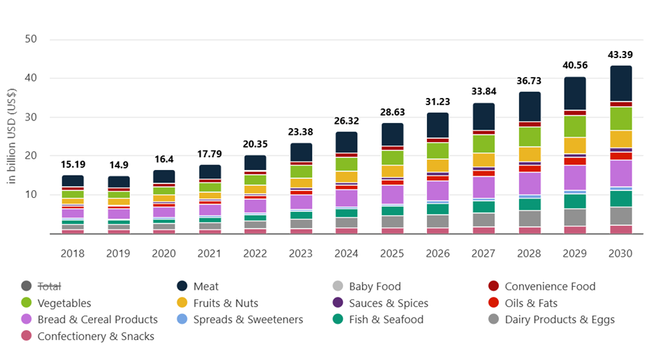 가나 식품 시장 규모는 2025~2030년 연간 8.7% 성장할 것으로 전망되며, 2025년 286억3000만 달러 규모로 예상된다. 2025년 기준 가장 큰 비중을 차지하는 것은 육류로 61억3000만 달러 규모로 예상되며, 일인당 식품 소비 금액은 연간 817달러로 추산된다. 온라인 판매가 증가하고 있지만 전체 시장에서 차지하는 비중은 아직 미미해 온라인 매출은 전체의 0.9%에 불과하다. 일인당 평균 소비량은 181kg로, 2026년에는 2.9% 증가할 것으로 전망된다.