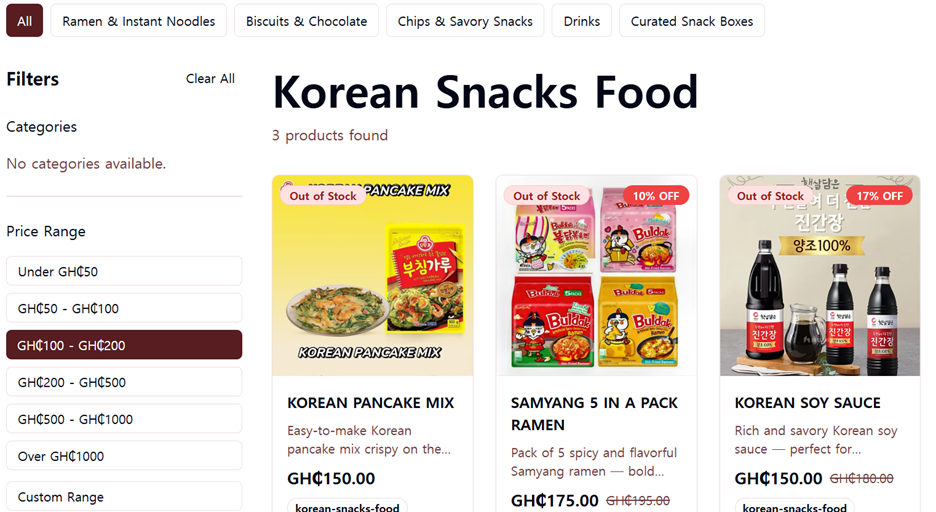 또 다른 온라인 한국 음식 판매기업 K 사 담당자는 K-드라마, K-팝, 소셜 미디어의 영향을 받는 젊은 층을 중심으로 최근 1~2년간 한국 음식에 대한 수요가 눈에 띄게 증가했다고 언급했다. 주요 고객층은 십대 후반부터 30대까지의 청년층이며, 인기 있는 품목으로는 인스턴트 라면, 빼빼로 같은 과자류, 바비큐 소스, 조미료, 음료 등이다. 최근에는 핫도그 같은 길거리 음식에 대한 관심도 증가세다. 한편, 한국식품 수입 관련 어려움으로는 비싼 운송비, 통관 지연, 덥고 습한 가나 기후로 인한 식품 보관 문제라고 언급했다. 이런 어려움에도 불구하고, 길거리 음식, 음료, 프리미엄 스낵, 즉석식 등에 대한 관심이 높아지면서 더 많은 젊은 소비자들이 한국 음식을 라이프스타일 트렌드로 받아들이면서 향후 지속적인 시장 성장을 전망했다.