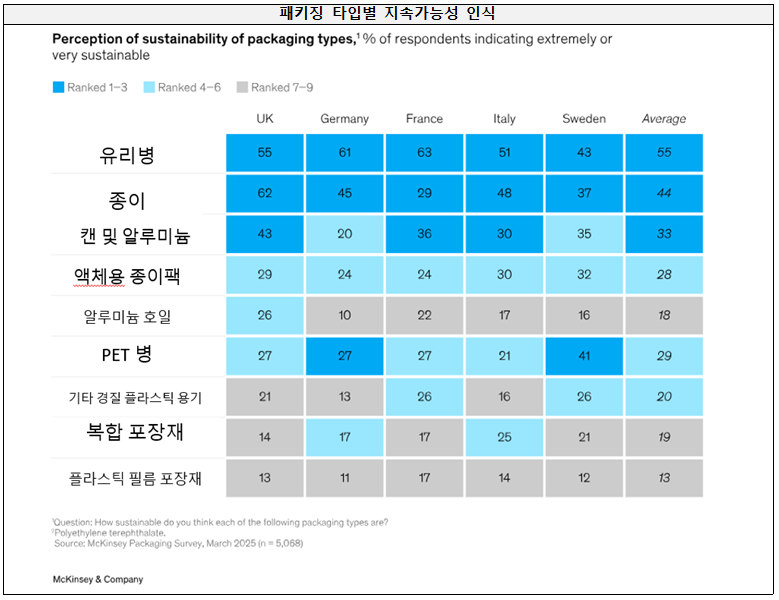 유럽 소비자들은 전반적으로 유리와 종이 기반 포장재를 가장 지속가능한 소재로 인식하고 있다. 특히 유리는 프랑스(63%)와 독일(61%)에서 높은 선호도를 보였으며, 종이·판지는 영국에서 62%가 매우 지속가능하다고 평가했다.