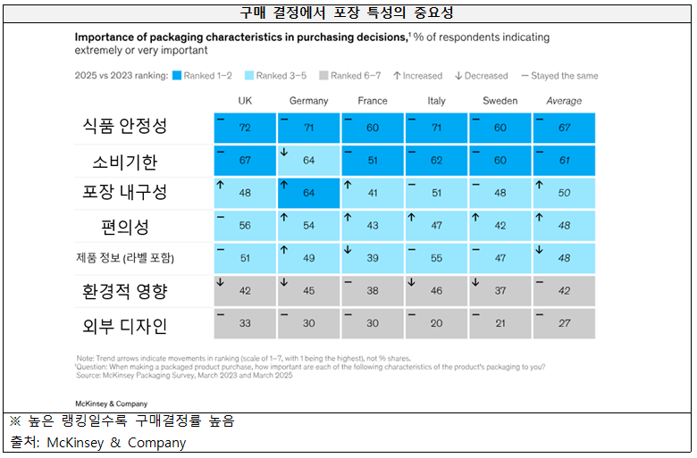 포장 특성 중에서는 식품 안전성과 유통기한이 소비자의 구매 결정에 가장 중요한 요소로 확인되었다. 환경적 영향은 상대적으로 낮은 우선순위를 보였으나, 유럽 소비자의 약 42%는 해당 요소를 중요하거나 매우 중요하다고 인식하고 있다.
