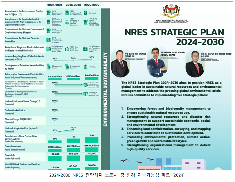 이와 함께 말레이시아 천연자원·환경지속가능부(Ministry of Natural Resources and Environmental Sustainability)가 발표한 2024–2030 전략 계획은 총 3단계에 걸친 점진적 이행 체계를 통해 지속가능한 환경 관리 시스템 구축을 추진하고 있다. 2025년까지인 제12차 말레이시아 개발계획과 연계해 2050년 탄소중립(net-zero) 달성이라는 국가 목표를 구체화하며, 온실가스 감축, 저탄소 도시 확대, 탄소시장 및 기후변화 관련 법·제도 정비, 단일 사용 플라스틱 감축 등 환경 분야 정책을 단계적으로 추진하고 있다.