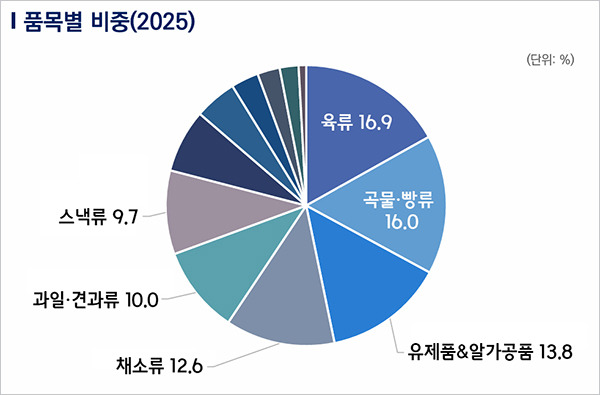 품목별로는 육류가 1조 5536억 달러 규모로 전체 16.9%의 비중을 차지했으며, 이어서 곡물·빵류가 1조4772억 달러로 16%의 비중을, 유제품류가 1조 2750억 달러 규모로 13.8%의 비중을 차지했다. 동시에 건강 지향 제품의 소비가 꾸준히 확대되면서, 채소류(12.6%)와 과일·견과류(10%), 스낵류(9.7%) 등에서도 경쟁력 있는 품목들이 뚜렷하게 나타났다. 이는 프리미엄과 건강 중심 소비트렌드가 전 세계적으로 공통으로 나타나고 있음을 보여주고 있다.